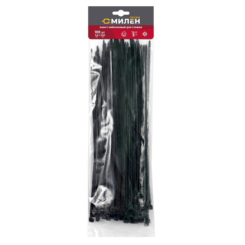 МИЛЕН Хомут-стяжка для кабеля 3,6х200мм нейлон черный (уп.100шт)