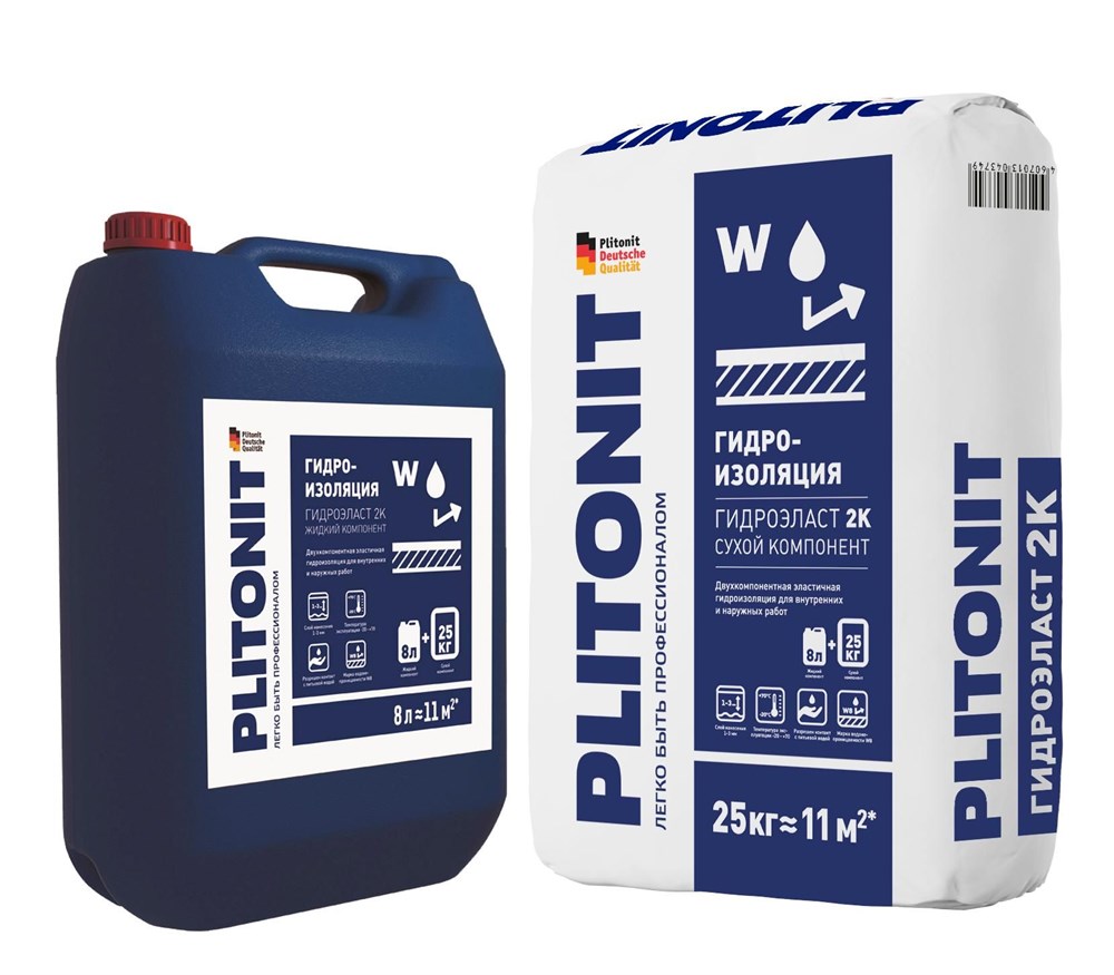 ПЛИТОНИТ ГидроЭласт 2К, комплект 25 кг+8 л, двухкомпонентная эластичная гидроизоляция